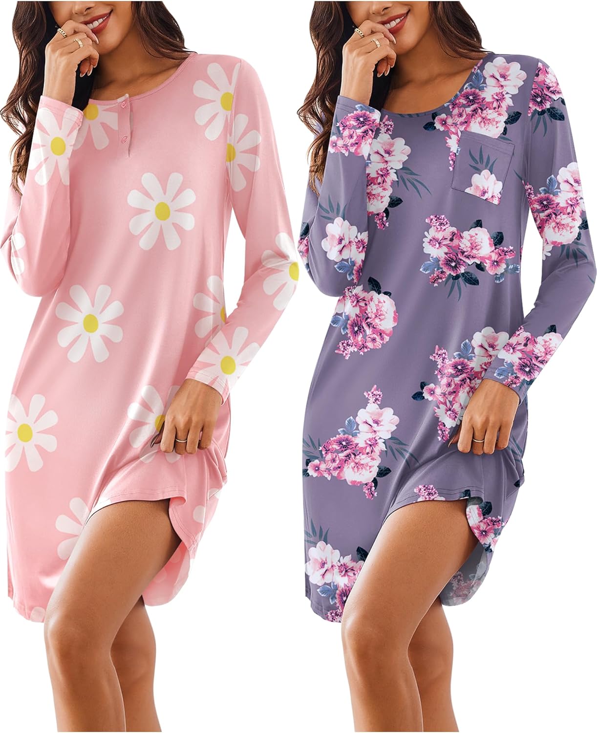 • 【Features】: Sleep dresses feature a loose and roomy design in jersey knit fabric with long sleeves. The nightgowns are designed with crewneck, kneen length. One of the nightshirt comes with chest pocket and the other comes with button design.