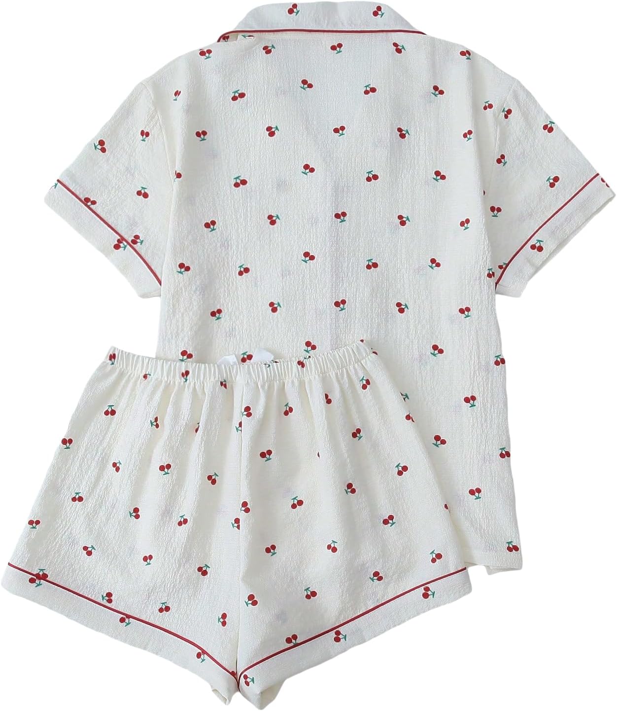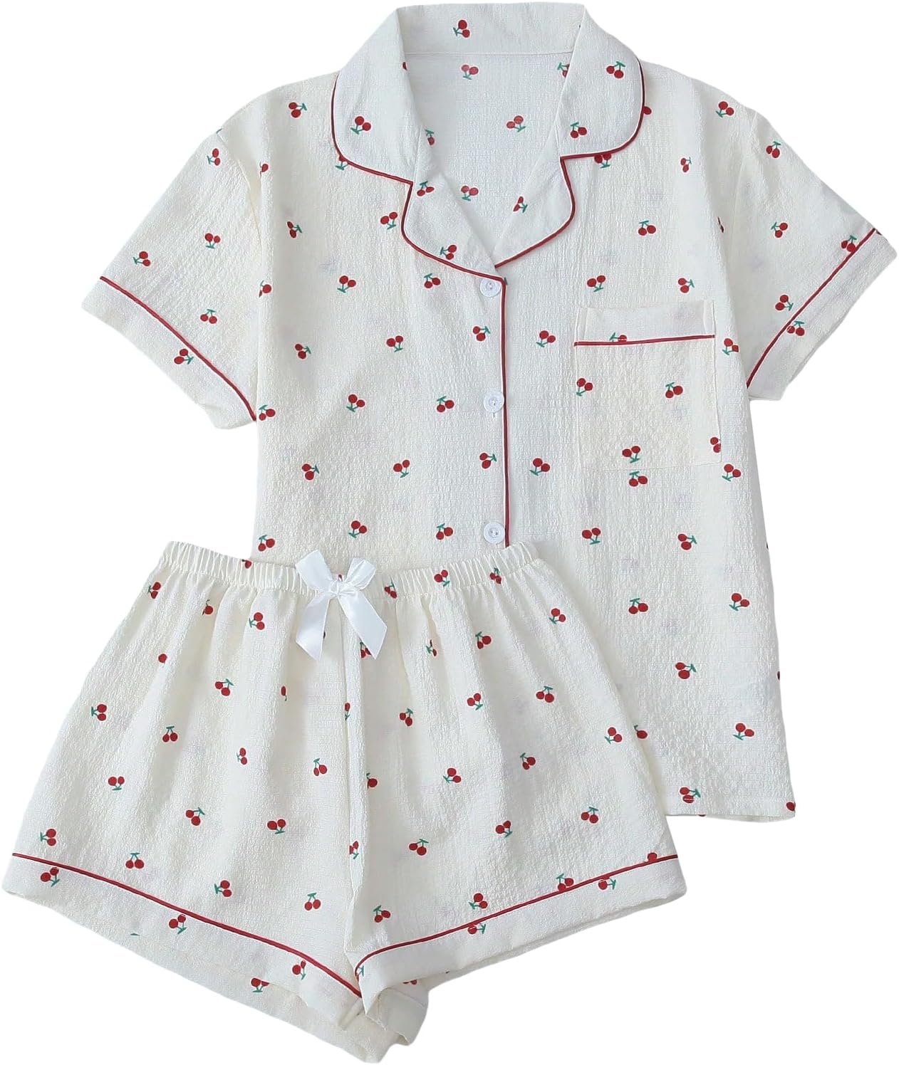 • Lapel Collar, Short Sleeve, Button Down Top and Shorts, Cherry Pattern, Pocket Front, Bow Front, Contrast Binding, Nightwear Pajama Sets