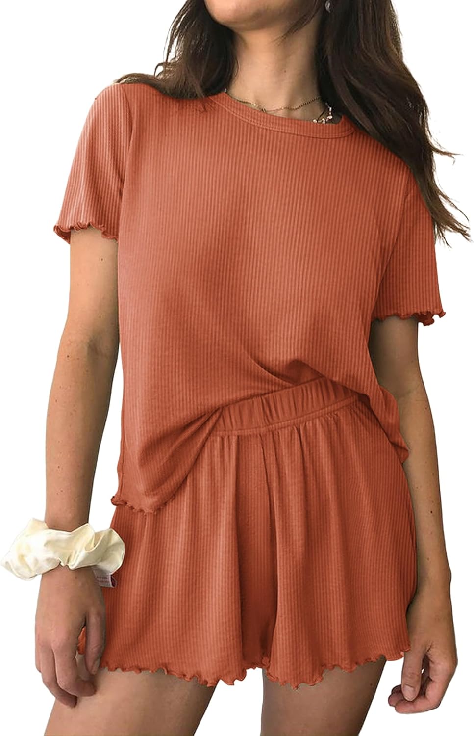 Women’s Pajamas 2 Piece Ribbed Knit Pjs Short Sleeve Sleepwear Set Summer Soft Pajamas Set Casual Lounge Sets